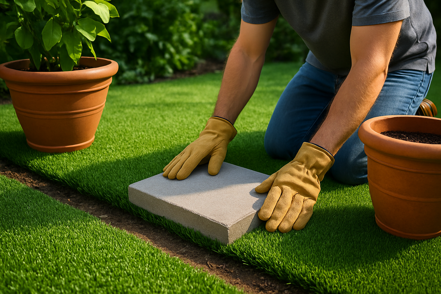- Weigh down turf edges with planters, sandbags, or pavers