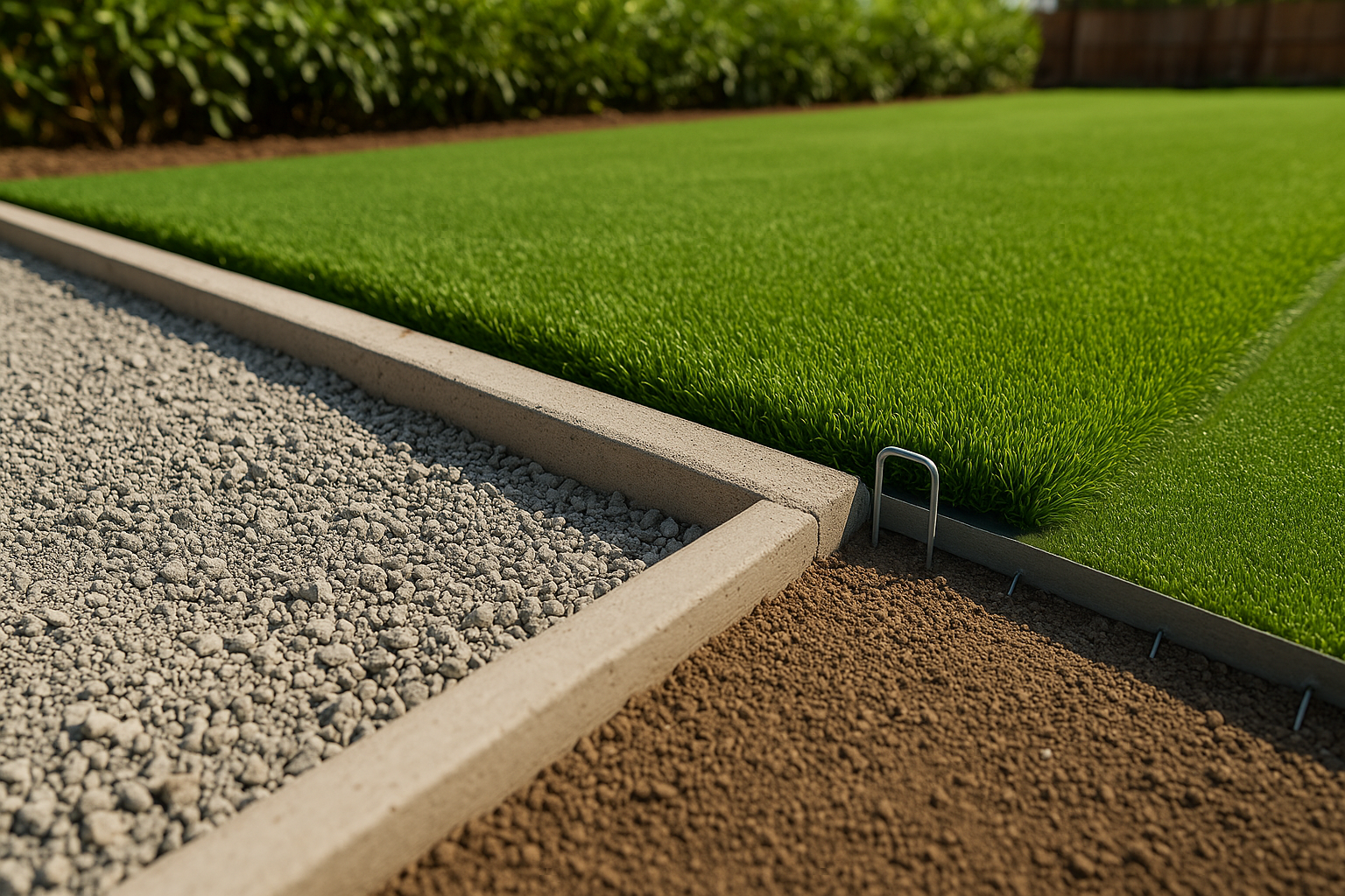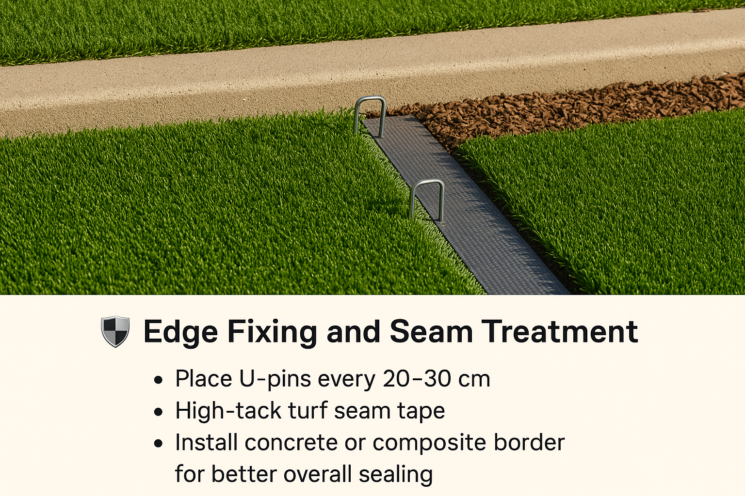 - Concrete curbs or U-pins to anchor the turf securely